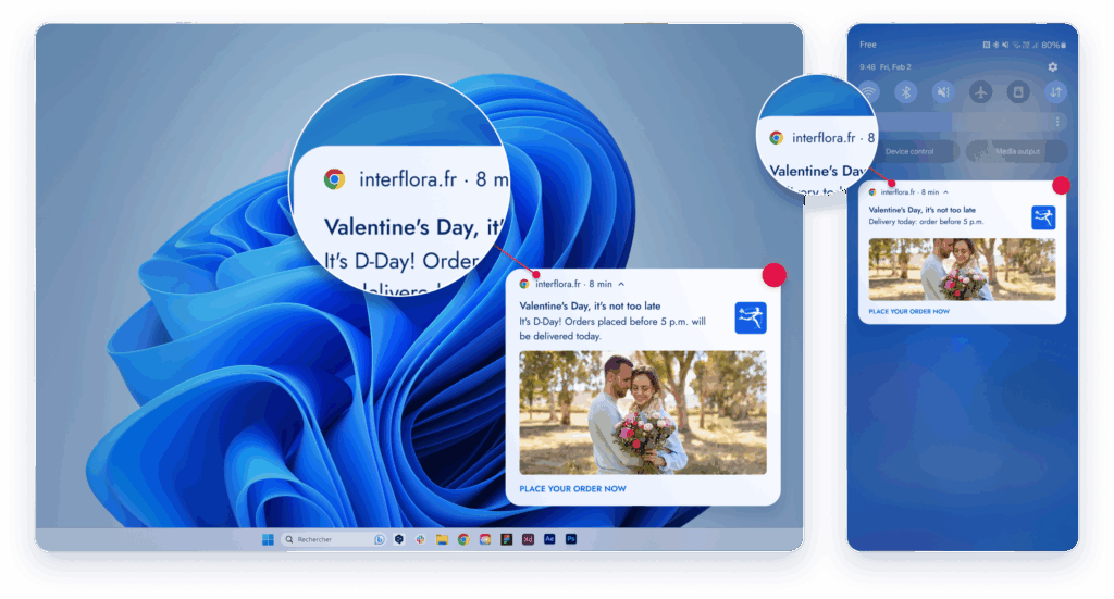 Entre las alternativas modernas al SMS, las Notificaciones Web Push destacan como una de las más innovadoras. Este mensaje clicable, enviado directamente por el navegador, aparece en la pantalla del usuario —incluso después de abandonar su sitio. En desktop o móvil (Android, y iOS desde Safari 16.4), los visitantes pueden suscribirse a sus notificaciones con un solo clic.