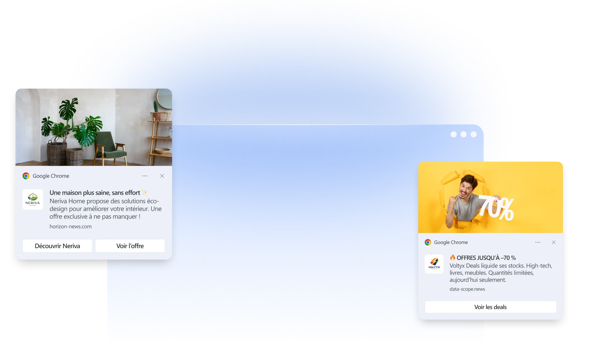 Activez un nouveau levier de monétisation grâce à la Web Push : un format 100 % opt-in, respectueux de votre ligne éditoriale, qui génère des revenus sans ajouter de nouveaux emplacements publicitaires sur votre site.